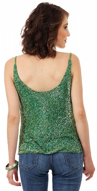 Spaghetti Straps Cowl Neck Beaded Blouse. Diagonal lines of pipe beads decorate this exquisite looking blouse appropriate for any kind of Formal Party. Pull over top in 100% silk with polyester lining. Imported.
