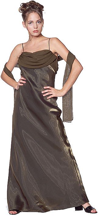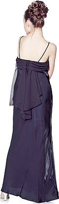 Spaghetti Straps Long Formal dress with gathered chiffon attached over the bust and at the back also. Hanging sash at the back of the flared dress. Shimmery polyester dress has a back zipper closure.