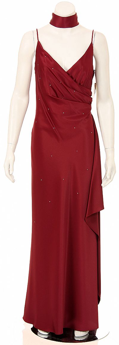 Full length satin dress with spaghetti straps, bust overlay.