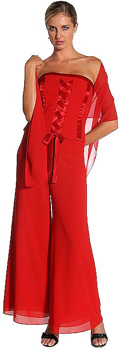 Two piece pant dress has a corset like top, strapless with back zipper closure. Pants have a wide leg. Matching scarf included.
