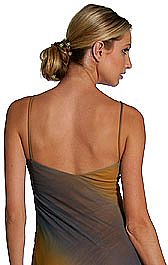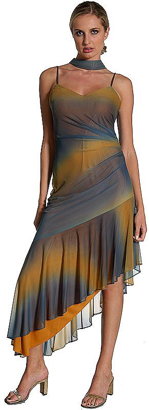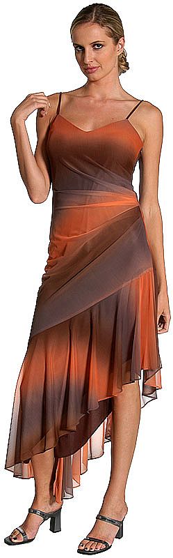 Two tone shirred dress with spaghetti straps & asymmetric hemline. Flared, ruffled and asymmetric hem gives an edge to this formal cocktail dress. Mid low back with side zipper closure. 100% polyester with stretchable polyester lining.