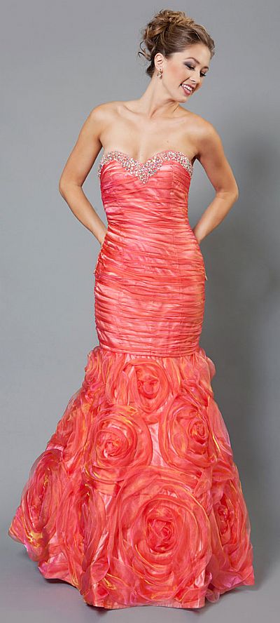 Two Tone Mermaid Style Strapless Prom Dress with beading. Sweetheart neckline has iridescent rhinestones bordering it. Bodice is all shirred and large rosettes adorn the skirt. Comes with easily attachable straps, matching scarf included & back zipper closure. Imported.