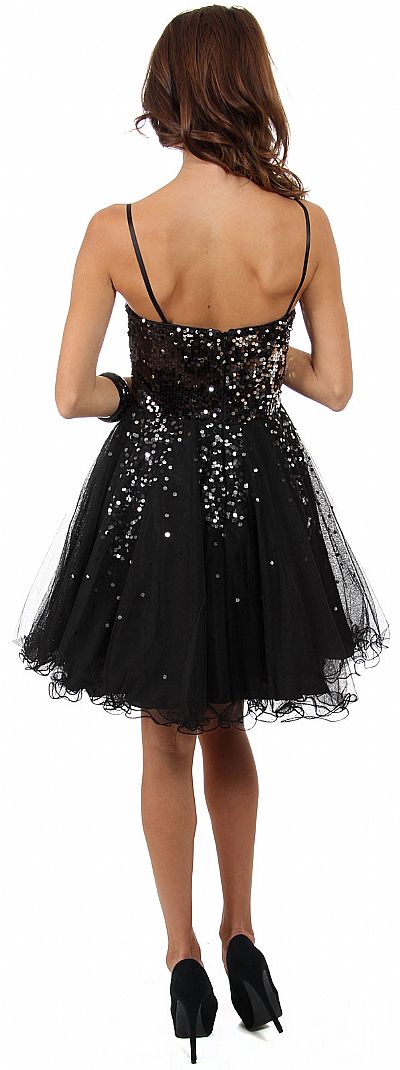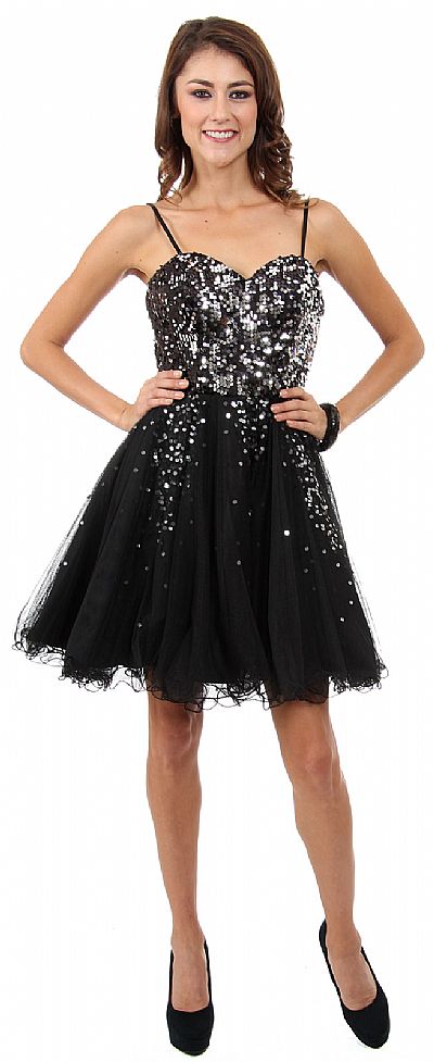 Spaghetti Straps Sweetheart Neck Short Party Prom Dress in Mesh Tulle. Sequins all over the bodice whereas elongated v-shape sequins on the skirt. Multi layered mesh skirt with ruffled hemline. Comes with mesh scarf & has back zipper closure. Spaghetti straps are removable. Imported.