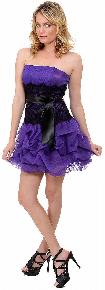 Strapless short prom bubble dress has an accentuating lace detail along the waist with bow. Pleated English net fabric adorns the bust area. Matching scarf included. Back zipper closure.