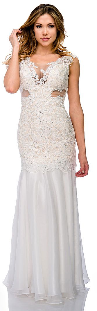 Sexy Mermaid Style Lace Bodice Long Formal Prom Dress. Sleeveless dress has a v-neck with sheer mesh in the center of bust & also at waist. Form fitting bodice in artistic pattern lace with rhinestones over it. Chiffon skirt is flared for easy movement. Side zipper closure & comes with matching scarf. Imported.