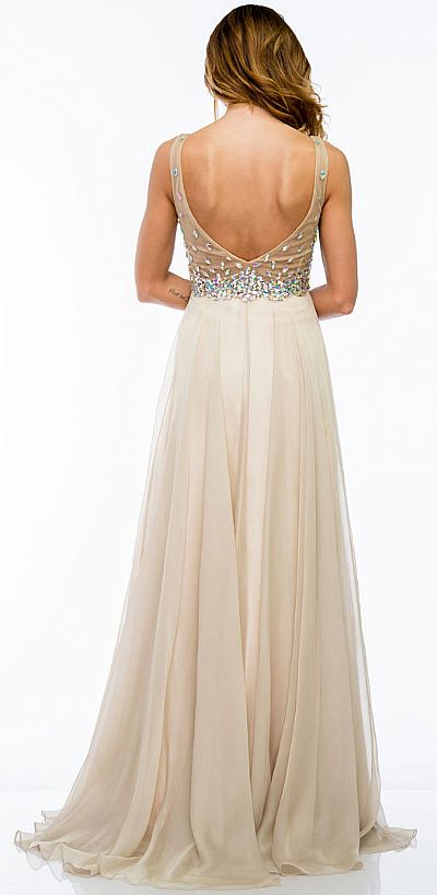 | V-NECK BEJEWELED MESH TOP FLOOR LENGTH FORMAL PROM DRESS (item #16116)