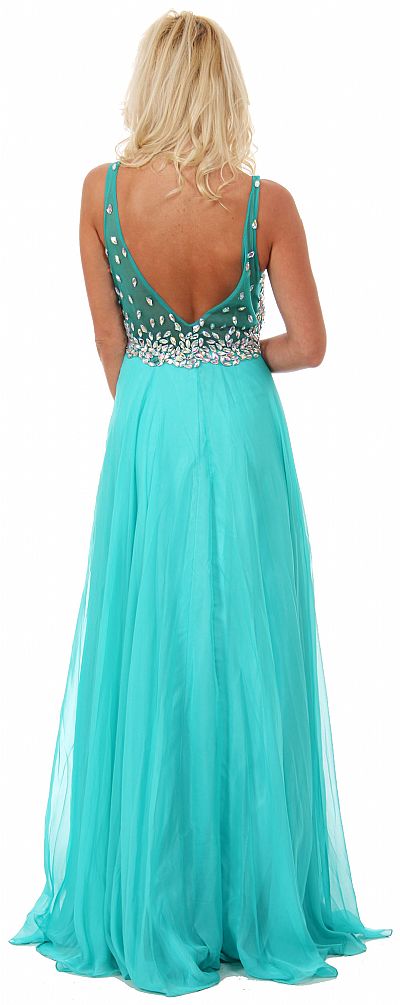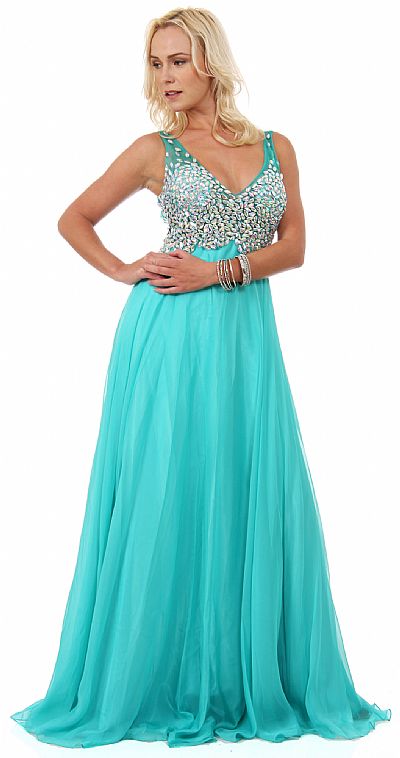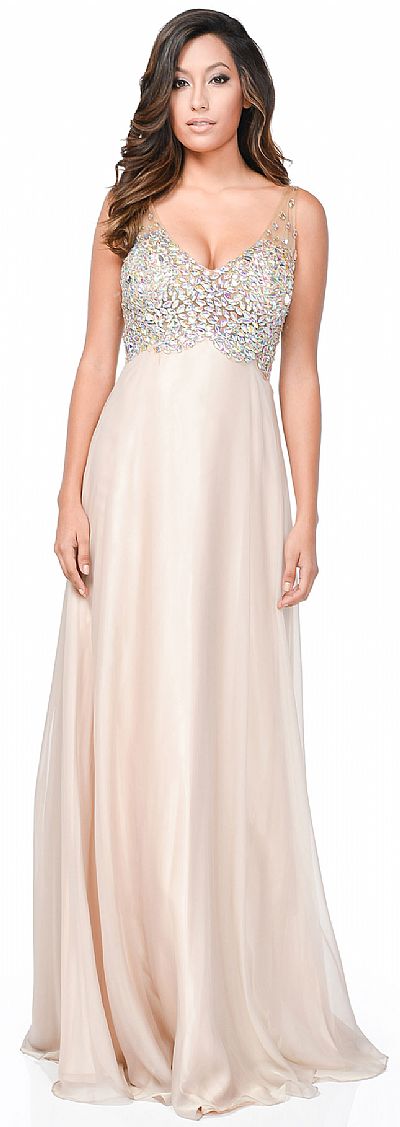 V-Neck Bejeweled Mesh Top Floor Length Formal Prom Dress. V-neck mesh bodice has chunky jewels in iridescent design with deep V-shape back also. Shoulder straps are sheer with side zipper closure. Imported.