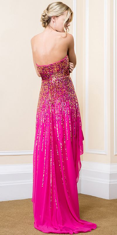 Strapless Sequined High-Low Prom Dress with Train. Sequins in varied colors run vertically downwards towards the hemline. & waistline has broad horizontal sequins pattern. Above knee length skirt in front & floor length at the back with train too. Back zipper closure. Imported.