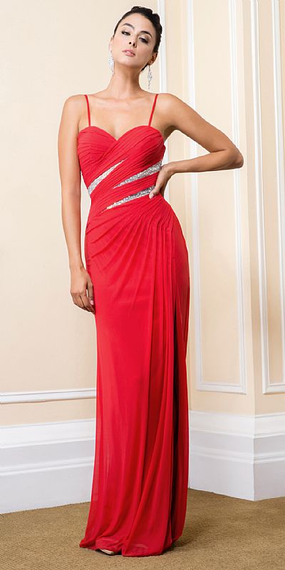 Sweetheart Pleated Formal Evening Gown with High Slit. Overlap style bodice has pleats on the bodice with sequins details. Spaghetti straps with high slit on the pleated side of the skirt. Mid-low back with side zipper closure. Imported.