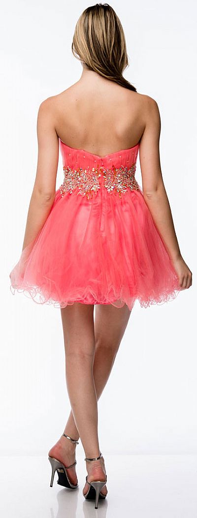 Strapless Beaded Waist Short Tulle Party Prom Dress. Exquisite floral beaded pattern at waist in rhinestones. Sweetheart neckline shirred bust has sparsely located rhinestones & also vertical lines of rhinestones at puffy skirt. Multi layers of tulle make the skirt little puffy with ruffled hemline. Imported.