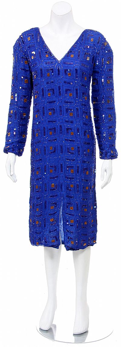 Tea length pull over dress has box shaped sequins pattern. It has a V-neckline, full long sleeves & small slit in the front. Shoulder padded and very light weight. Made of 100% silk with polyester lining. Imported.