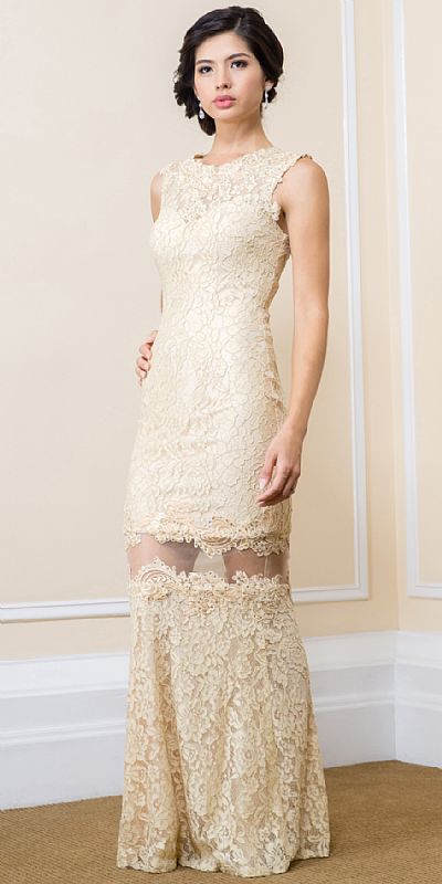 Stylish Floral Mesh Lace Accent Long Prom Pageant Dress. Round neck dress has sweetheart neckline on the inner layer and sheer above the bust & back too. Sleeveless with lace accent on neckline & at sheer gap above the knees too. Fitted bodice with little flared skirt. Back zipper closure.