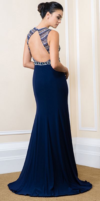 Bejeweled Bust Keyhole Back Long Formal Prom Dress. Jewels in varied colors & shapes decorate the bodice all around with a big keyhole at back. Sleeveless dress has a round neckline with flared skirt having train at the back too. Mid-low back is sheer with hook closure & zipper closure too. Imported.