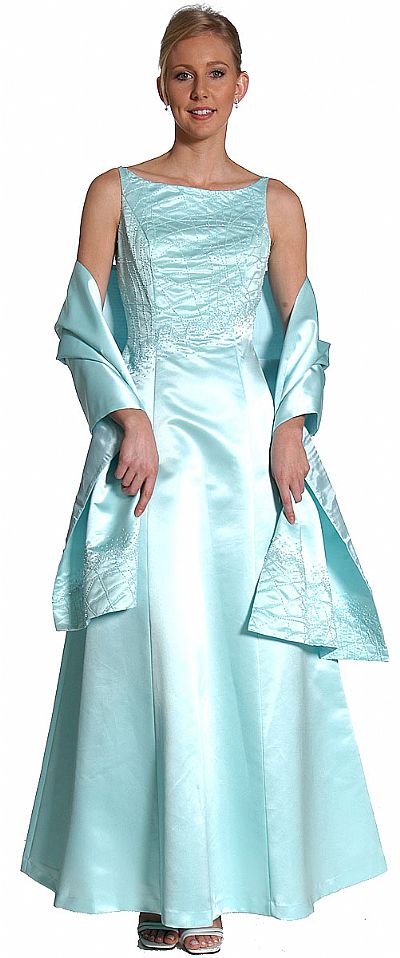Boat Neck A-line Classical Formal Prom Dress with Spaghetti Straps at the back. V-shape back with zipper closure. Geometrical pattern beading at the bodice & back also. Matching Scarf not included. Imported.