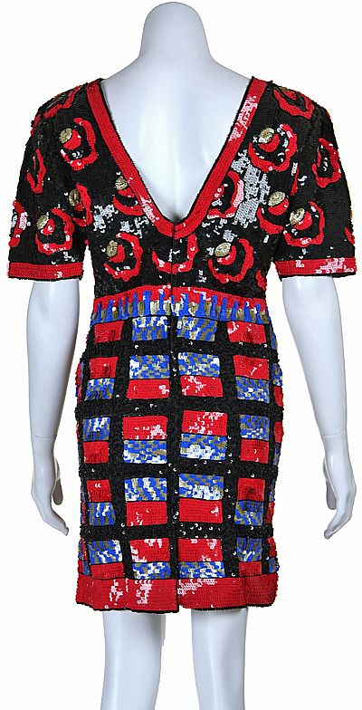 A short cocktail dress made from sequins and beads. Dress has half sleeves, a v-shaped open back, and a small back slit. Round neckline short cocktail dress.