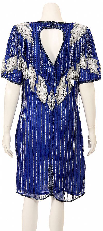 Fully beaded short sleeved cocktail dress with a V-pattern sequin design and hanging bead straps. Opened back key-whole following a back zipper. Imported.