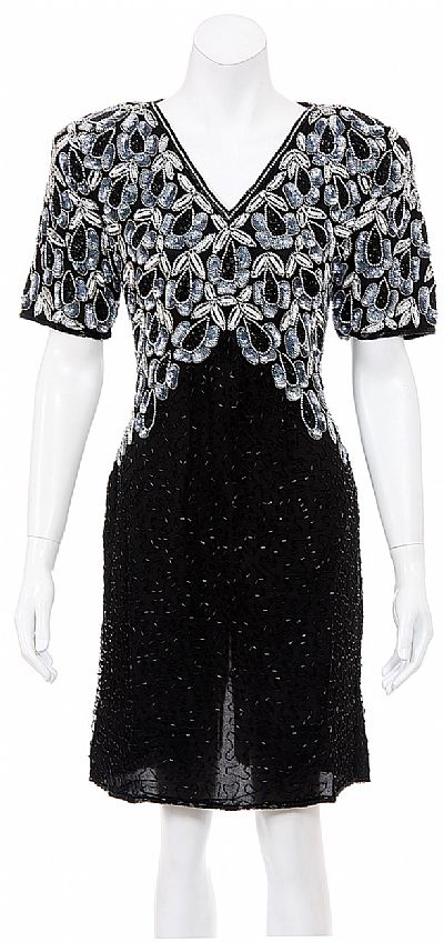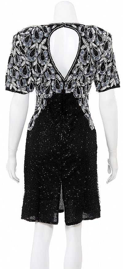 Hand Beaded short dress with elaborated sequin and beads details. Details on dress are of black, silver and white tones. Short sleeved and shoulder padded. Dress has a V-neckline, key-hole back and a back zipper closure. Small slit in the back.