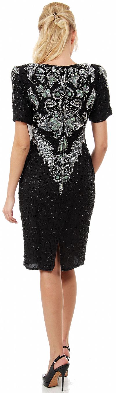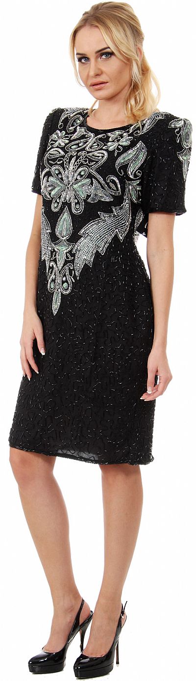 Short Sleeves Artistic Beaded Bodice Short Formal Party Dress. Round neck dress is fully beaded with elaborate floral beads & sequins pattern all around the bodice. Short sleeves with shoulder pads on 38" long dress. Closed back with zipper closure & a small slit also. Silk chiffon with polyester lining. Imported.