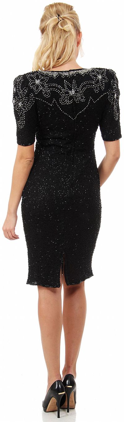 V-Neck Floral Bodice Half Sleeves Formal Sequined Dress. Artistic floral pattern in dotted style on the bodice extended to the back & sleeves also. V-Neck dress has shoulder pads, half sleeves & closed back with zipper closure. Small slit at the back of 38" long dress. Imported.