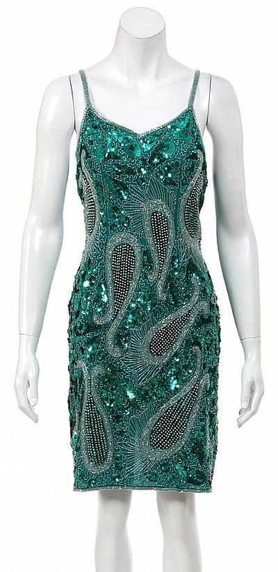 Short Spaghetti strapped sequin beaded cocktail dress with a broad v-neck. The dress has pasley shapes thick beadwork all over the dress with an elastic at back. Small slit at back & a back zipper closure.
