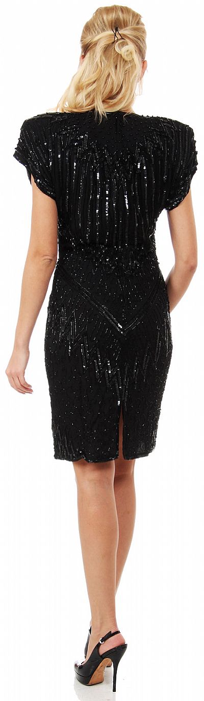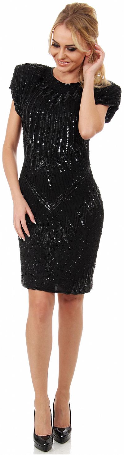 Wide Shoulders Cap Sleeves Sequined Short Formal Party Dress. Fully beaded dress has an attractive sequins pattern in zig-zag shape around neckline, waist & hips all over. Shoulder padded dress with cap sleeves give that vintage look to this beautiful dress which is 37" in length. Closed back with zipper closure. Imported.