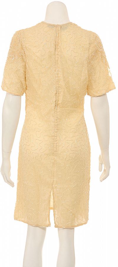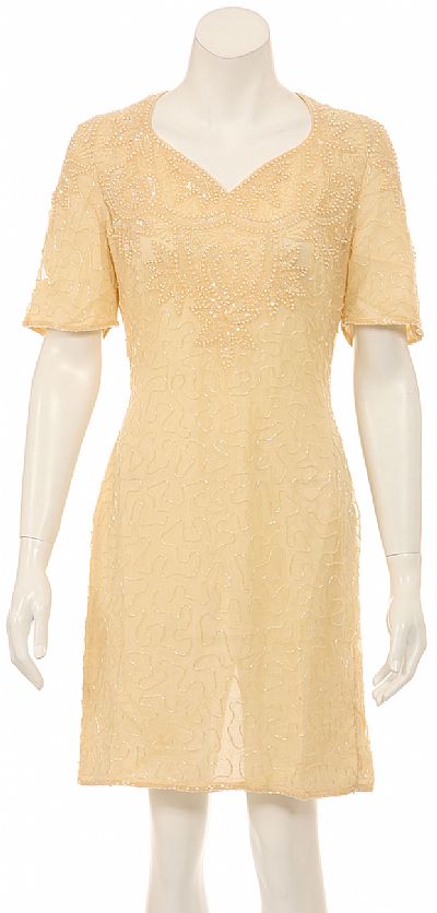 Light Weight hand beaded formal dress wtih a Sweetheart Neckline and closed back. Short sleeves. Small opening on back end of dress.
