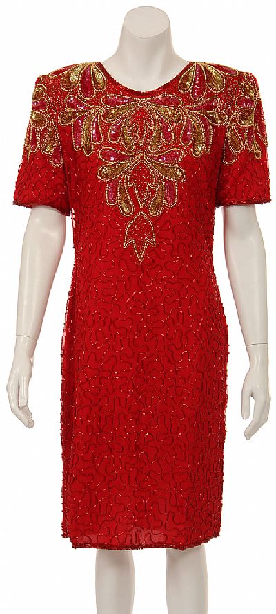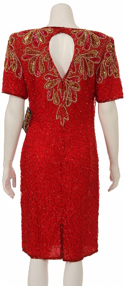 Short sleeved tea length cocktail dress with multi-colored sequin leaf petal designs on bodice. Key-hole open back with zipper closure. Plus size dresses may have a closed back.