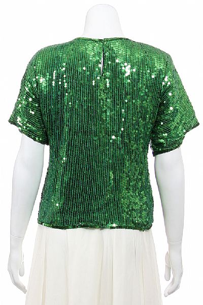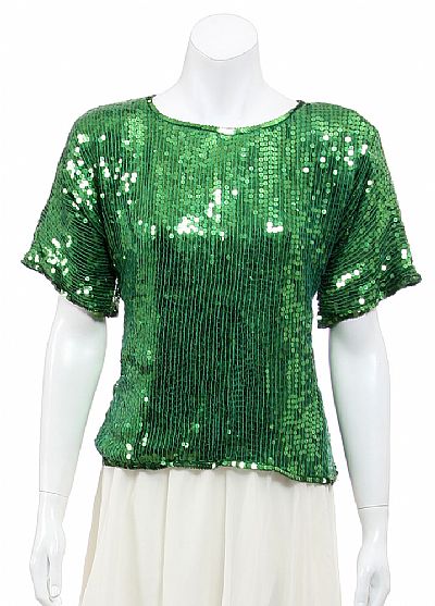 Pull over top is fully hand sequined. Top has short sleeves and a round neckline. Imported.