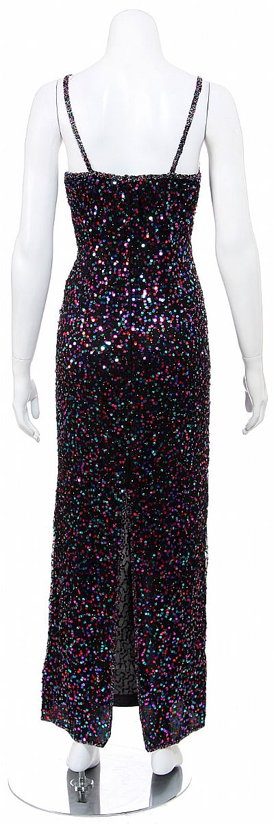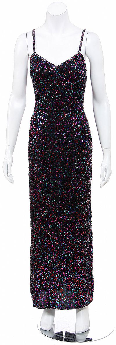 Full length dress is fully hand sequined. Dress has a sweetheart neckline, thin spaghetti straps and a back zipper closure. Made of 100% silk with polyester linning. Imported.