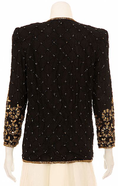 Long jacket with hand beaded connecting angled-squares detail. Accentuating hand beaded sequin gold flowers, look alike bees and leaves; creating the effect of a growing garden. Shoulder padded, front hook closure and small slit in front.