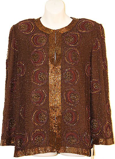 Round neck full sleeves Sequin/Pipe beaded jacket with hook closures in front. Handmade from natural silk chiffon. Length is 28 inches approx.