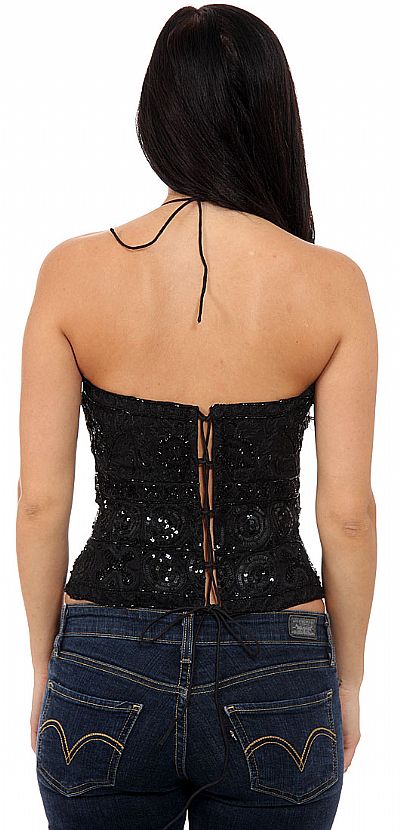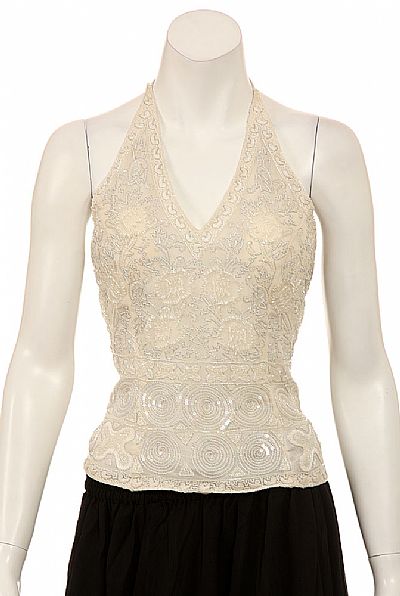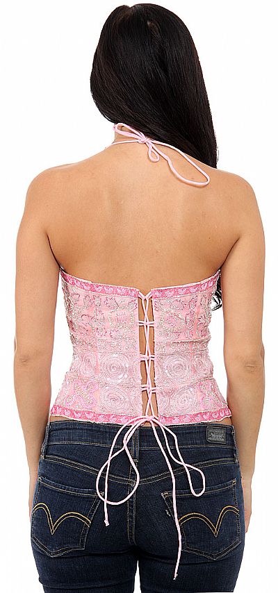 Finely detailed halter top. Corset tightens in the back with lace and ties at neck. Fully lined with V-neckline. Accentuating silver tones. Measures 20 inches.100% silk with polyester lining. Imported.