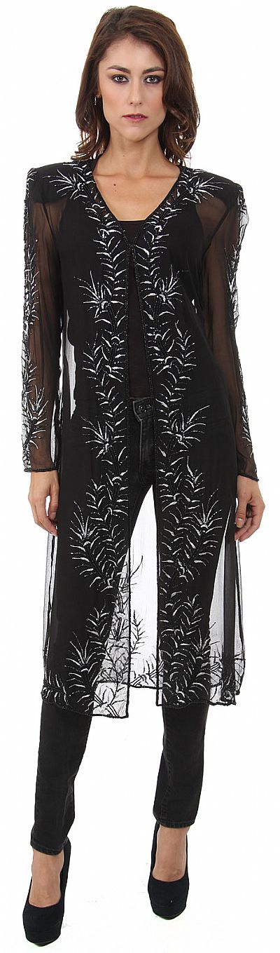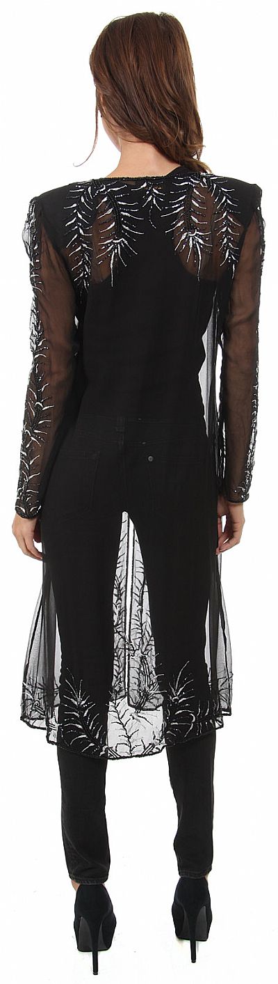 Collared Full Sleeves Sheer Short Jacket with Beading. Artistic beaded stems with silver thread leaves pattern all over the jacket including sleeves, collar & back of jacket. Double hook closure & shoulder padded. 100% silk chiffon jacket is 26" long approx. Imported. Can be teamed up with dress pants or casual jeans at night.