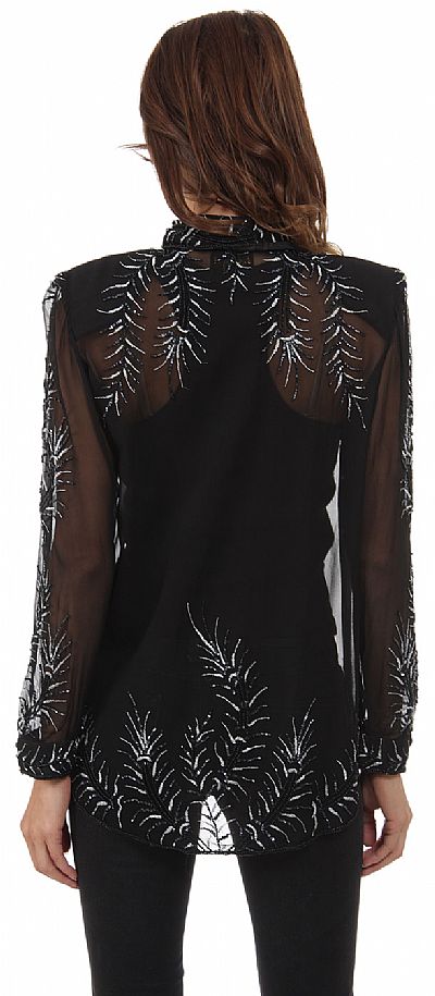 V-Neck Full Sleeves Tea Length Sheer Beaded Jacket. Artistic beaded stems with silver thread leaves pattern all over the jacket & also vertical pipe beading starting at the neckline running along the front opening & ending at the hem of jacket. Double hook closure & shoulder padded. 100% silk chiffon. Imported. This long jacket can be worn over a dress, teamed up with dress pants or worn casually with jeans.