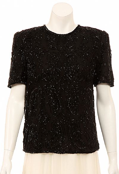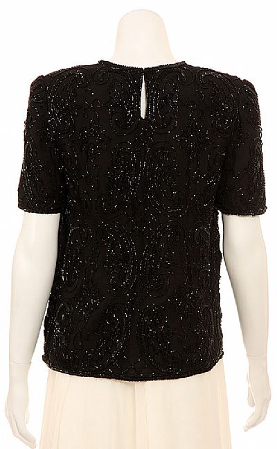 Pull-over top with a jewel neckline and short sleeves. Elaborated sequins and beads design. Top has small key-hole opening in the back which closes with small hook. Shoulder padded.