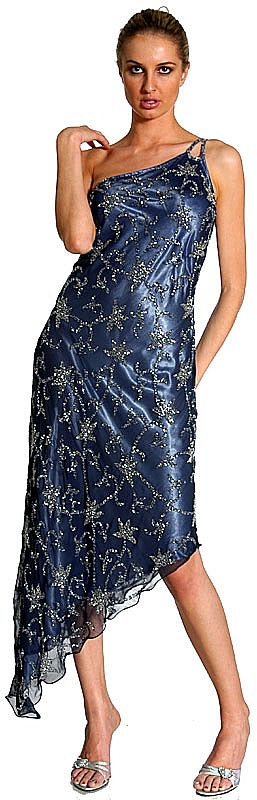 Single shoulder hand-beaded dress. Asymmetic hemline; 100% pure silk.