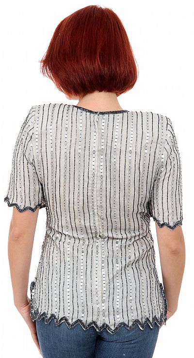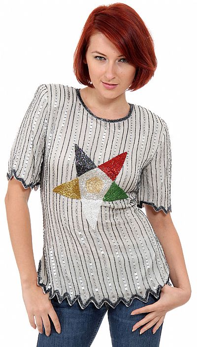 Fully hand beaded blouse with accentuating colorful star at center. Blouse is short sleeved and shoulder padded. Jewel neckline. Asymmetric sleeves and hemline. Back zipper closure. 100% Pure silk. Lining 100% polyester. Imported.