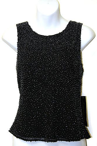Round neck sleeveless beaded blouse. Back has a little low u-neck with zipper closure. Silk chiffon over polyester lining.