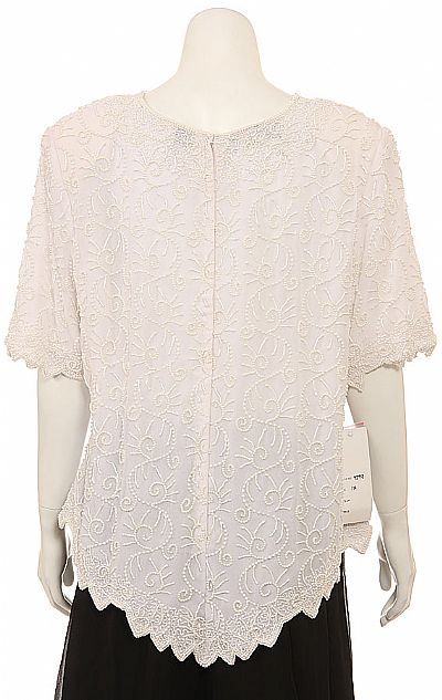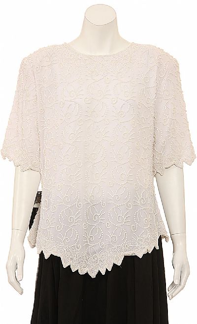 Fully beaded short sleeve blouse. Embellished with a unique beading design and nicely cropped hemline. Back zipper closure. Made of 100% Silk Chiffon. Imported.
