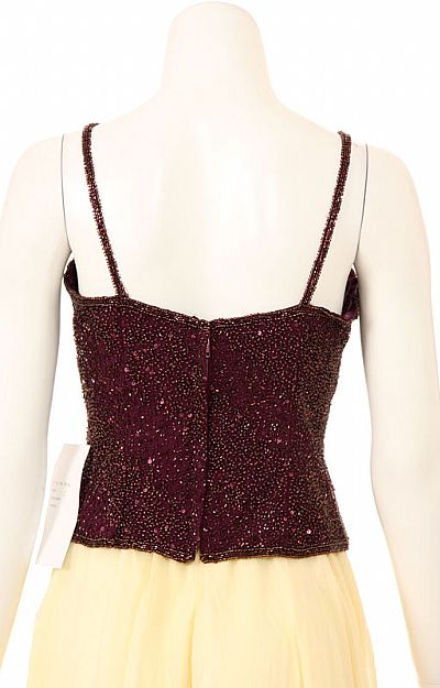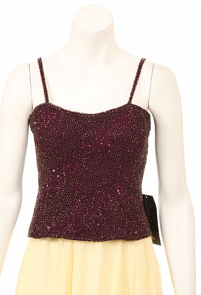 Spaghetti strap fully sequined blouse with a complete opened back zipper closure. Made of 100% Silk Chiffon. Imported.