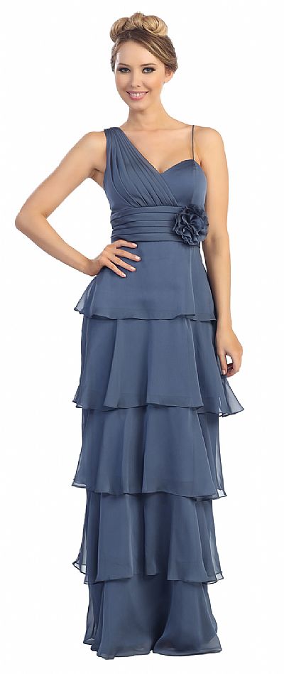 One Shoulder Tiers & Ruffles Long Formal Evening Prom Dress. Shoulder strap is pleated extended over the bust with noodle strap on the other side. Pleated waistband with floral applique on the side. Tiered skirt with cascading ruffles. Back zipper closure. Imported.