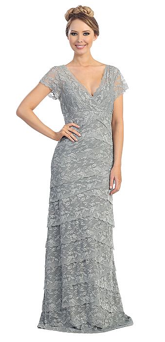 V-Neck Cap Sleeves Tiered Lace Long Formal Evening Dress in Silver