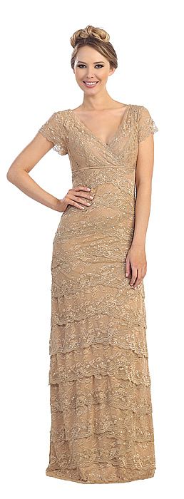 V-NECK CAP SLEEVES TIERED LACE LONG FORMAL EVENING DRESS