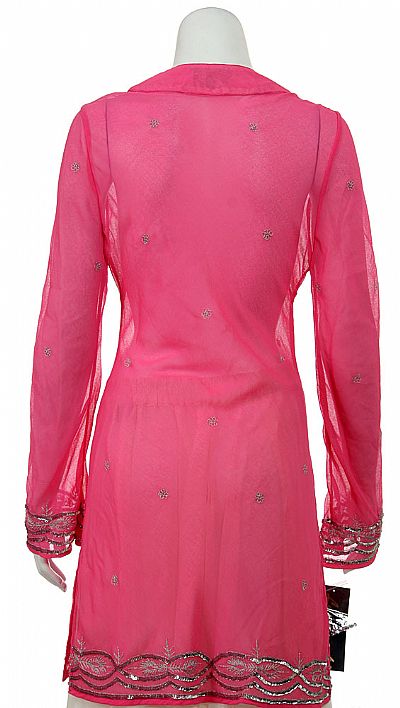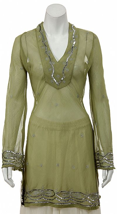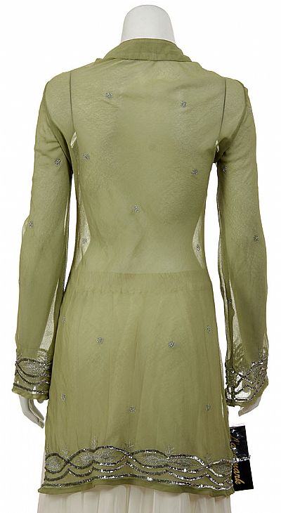 V-neck long Sheer blouse with beading at neckline, end of sleeves & hemline. Full sleeves & slit on both sides of the blouse. Pull over top. Imported.
