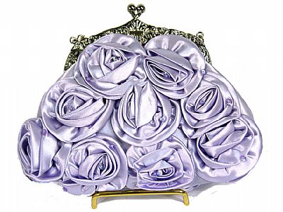 Royalty inspired satin flowered clutch and detailed top metal frame with a kiss lock, in lilac. Measures: 9 x 6 x 3.5 inches