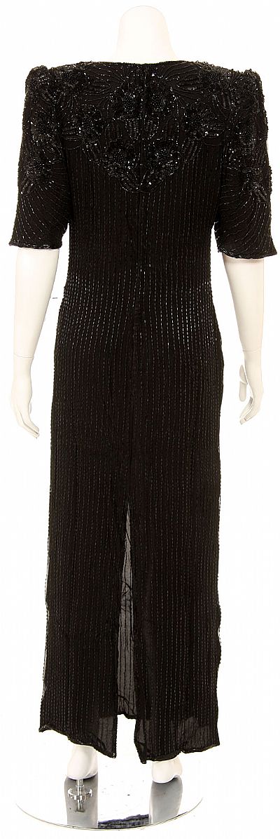 Fully beaded short sleeved evening gown made with a sequined beading design along the bust, shoulders, and back. Back opened slit. Back zipper closure. Made of 100% Silk Chiffon.