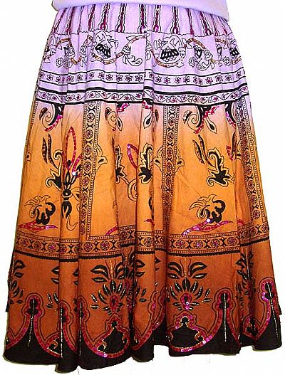 Full circle tee-length skirt in exquisite print. Paisley-inspired motif is sequined. Coordinating hues combined together as background gives this skirt a great look; made of 100% cotton. Side zipper; washable. 28 inches length. Imported.