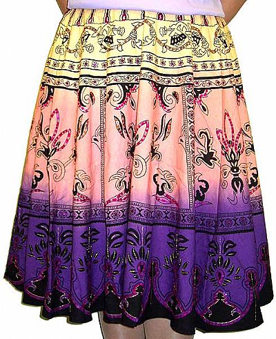 Full circle tee-length skirt in exquisite print. Paisley-inspired motif is sequined. Coordinating hues combined together as background gives this skirt a great look; made of 100% cotton. Side zipper; washable. 28 inches length. Imported.
