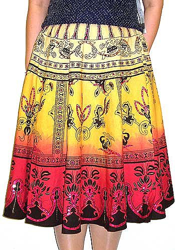 Full circle tee-length skirt in exquisite print. Paisley-inspired motif is sequined. Coordinating hues combined together as background gives this skirt a great look; made of 100% cotton. Side zipper; washable. 28 inches length. Imported.