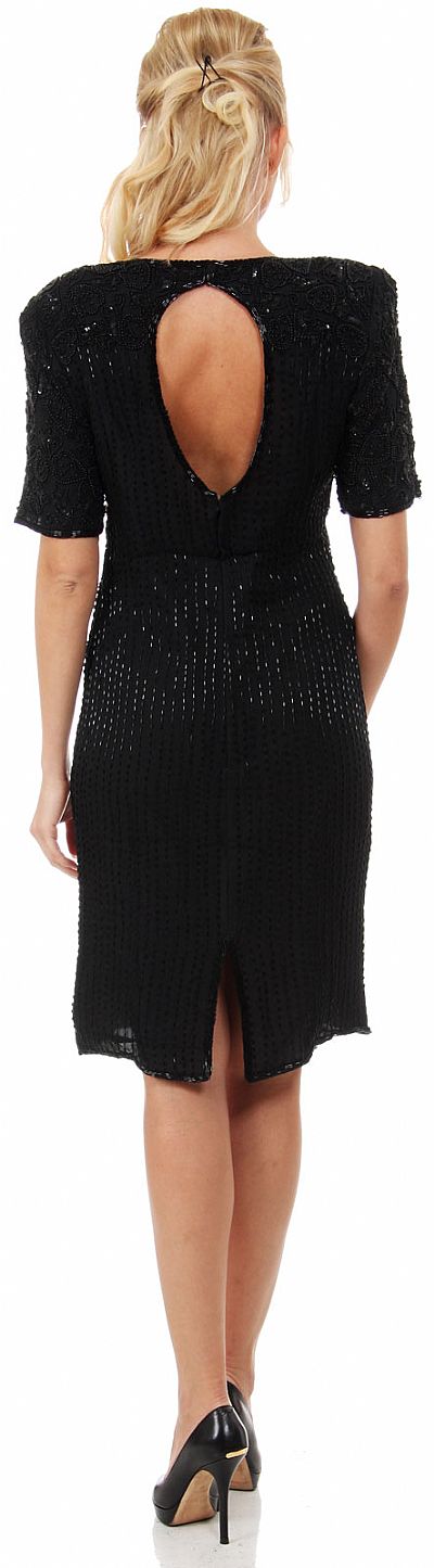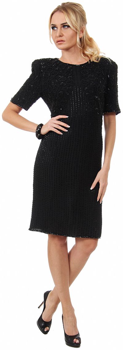 Round Neck Beaded Short Formal Dress with Jacket like Bodice. Vertical lines of beads all over the dress with short jacket like beaded pattern at the bodice. Half sleeves with shoulder pads on 39" long dress. Big keyhole at back with zipper closure. Silk chiffon with polyester lining. Imported.
